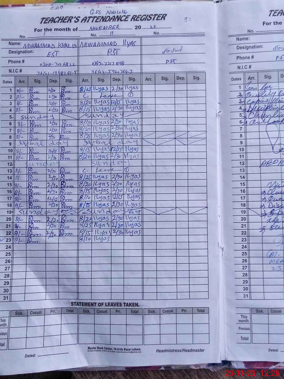 | CNIC | Full Name | Designation | R/C | Absence During Last Calender Month |