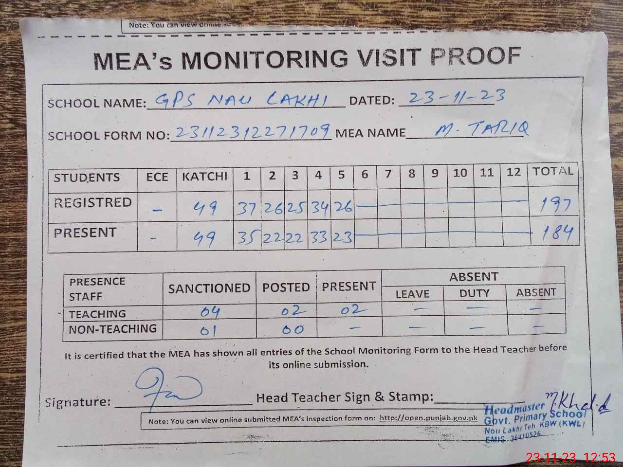 | Attendance Register | Head Teacher | MEA with School | Visit Proof |