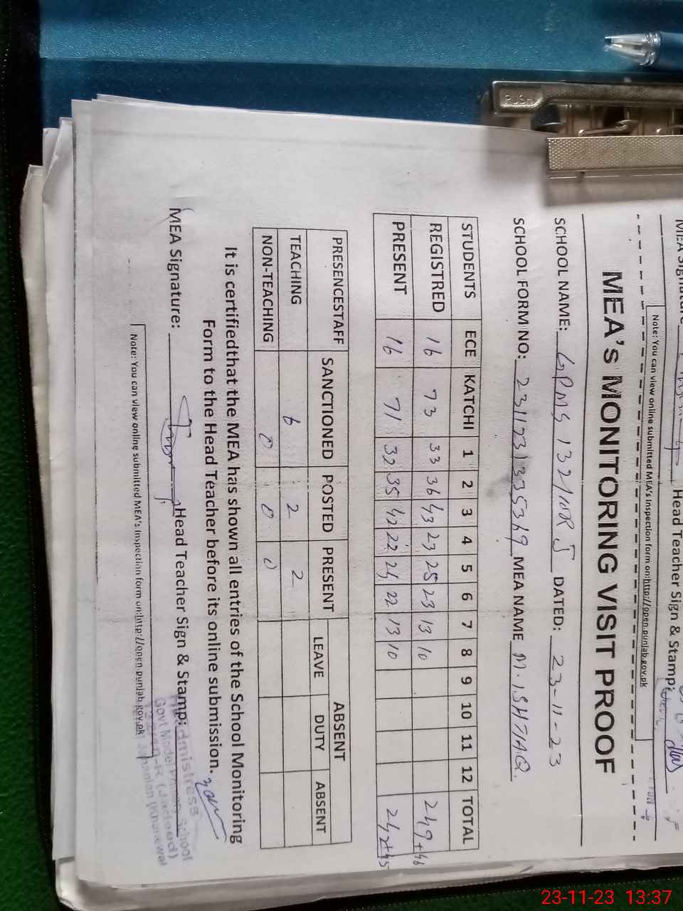 | Attendance Register | Head Teacher | MEA with School | Visit Proof |