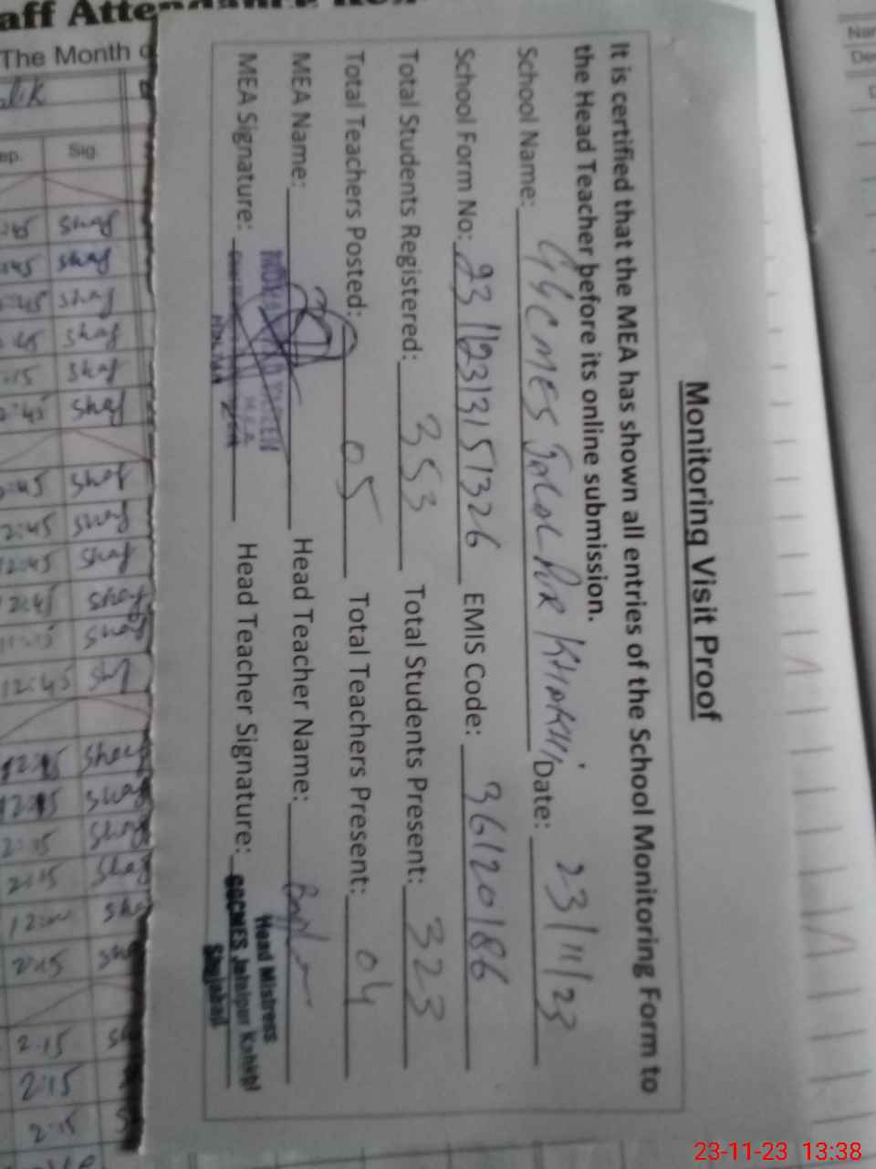 | Attendance Register | Head Teacher | MEA with School | Visit Proof |