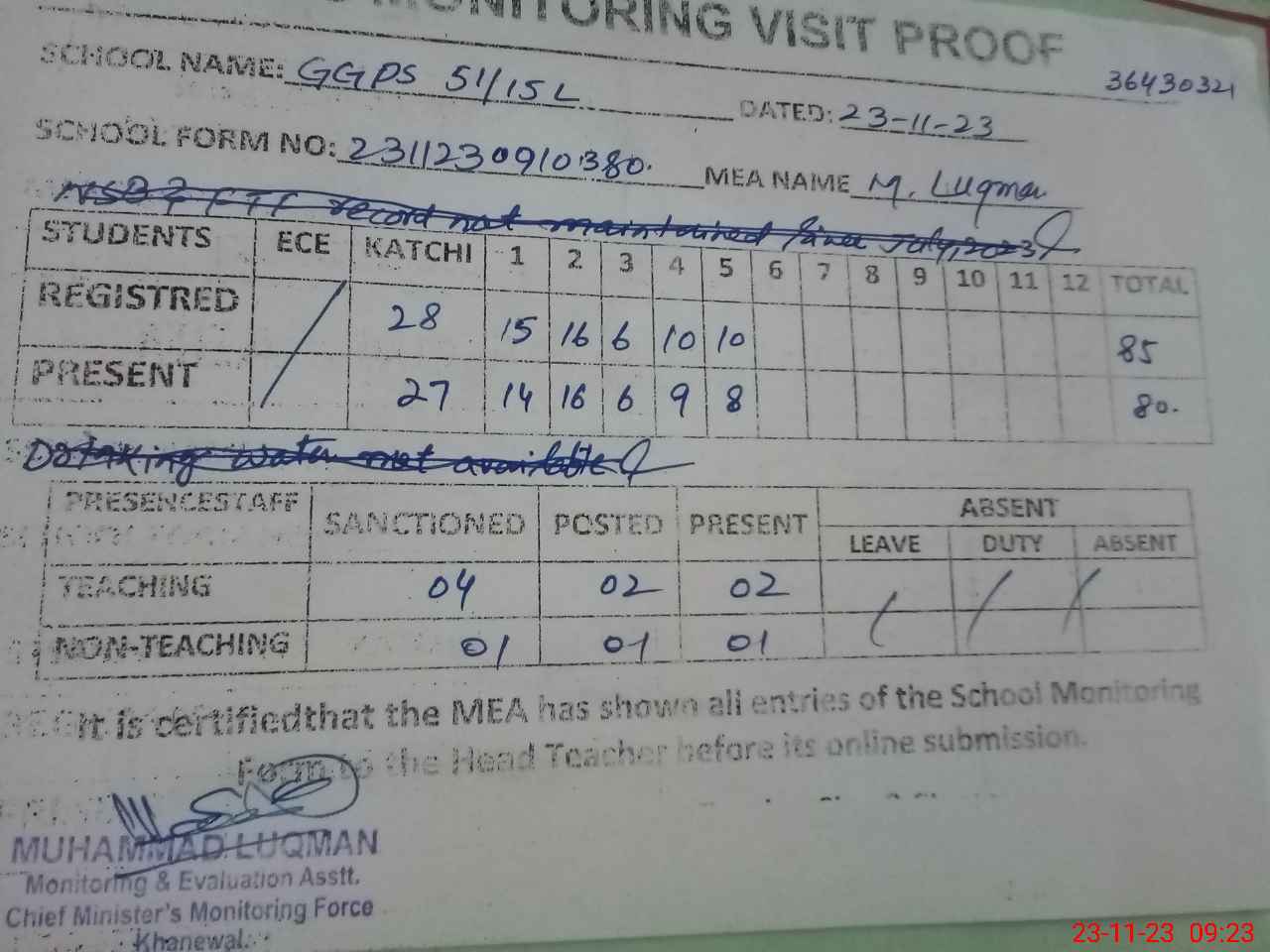 | EMIS Code: 36430321 | Name of School: GGPS 51/15-L, MIAN CHANNU | |||