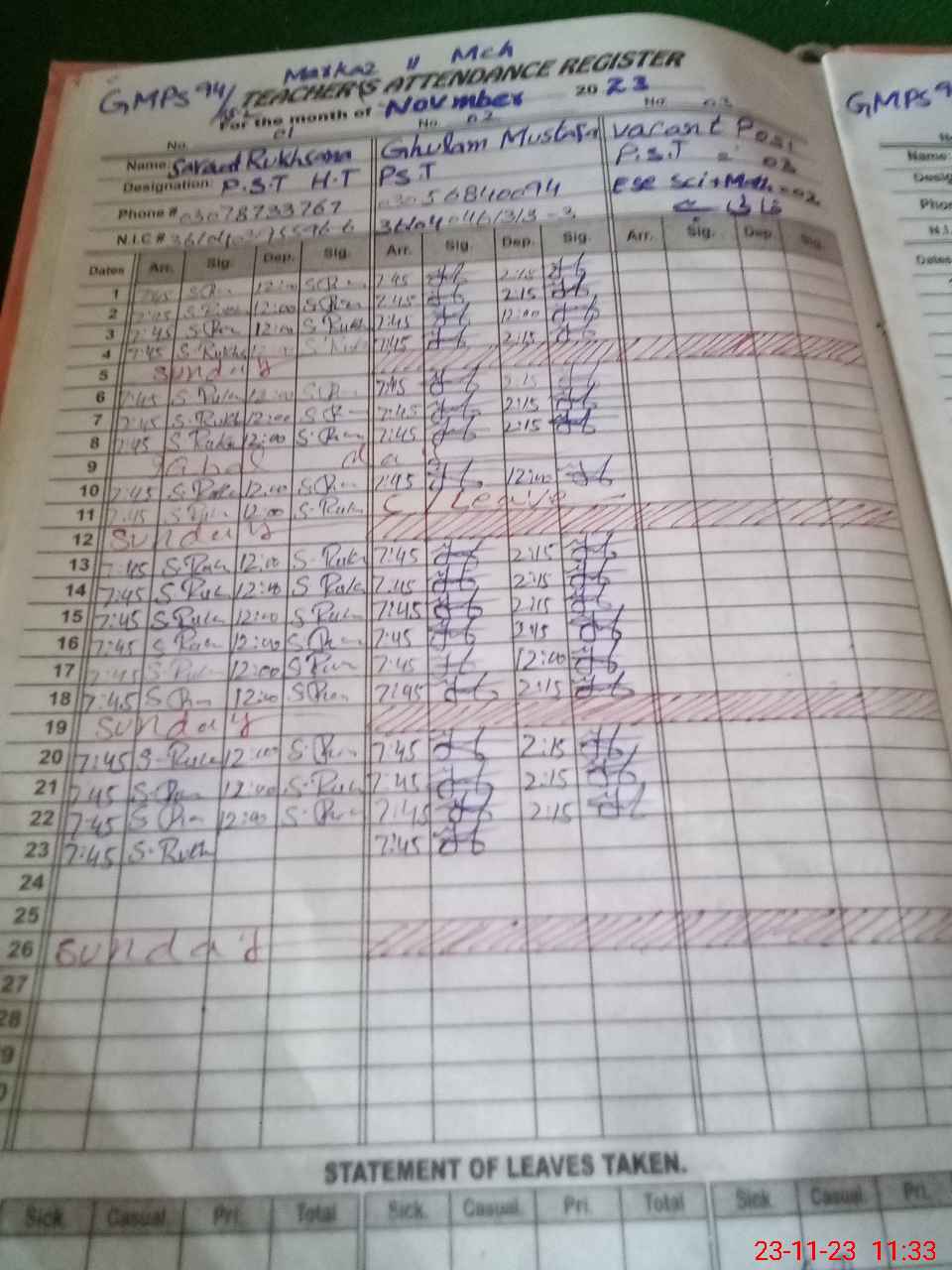 | Name: SA**** RU**** Designation: (School Headmaster's/Headmistress's) PST Phone/Cell Number: 03**** |