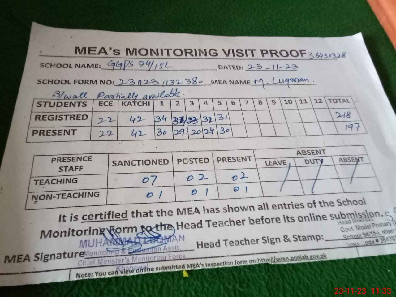 | Attendance Register | Head Teacher | MEA with School | Visit Proof |