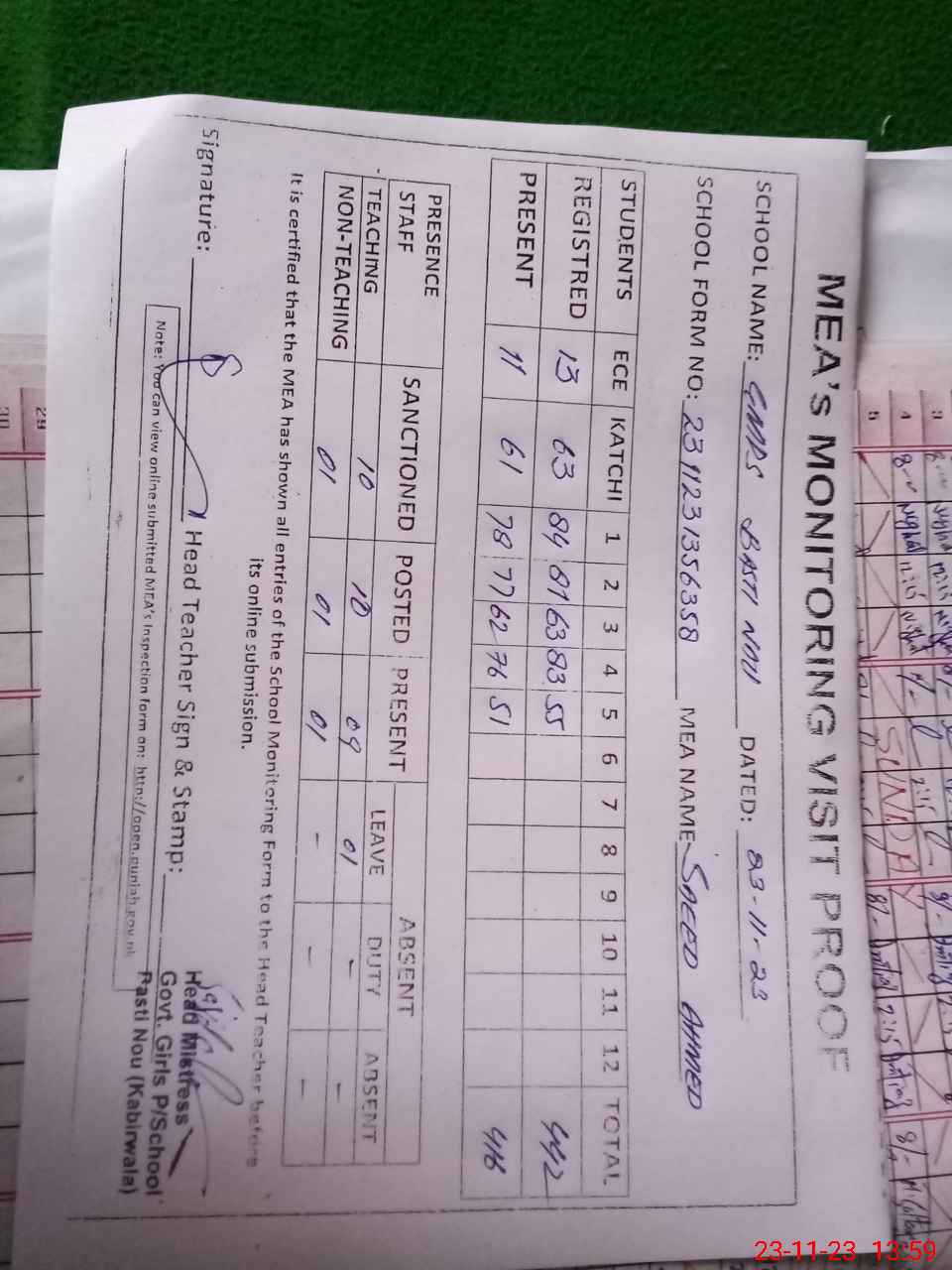 | Attendance Register | Head Teacher | MEA with School | Visit Proof |