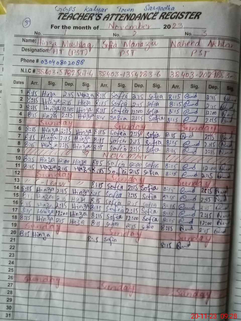 | CNIC | Full Name | Designation | R/C | Absence During Last Calender Month |
