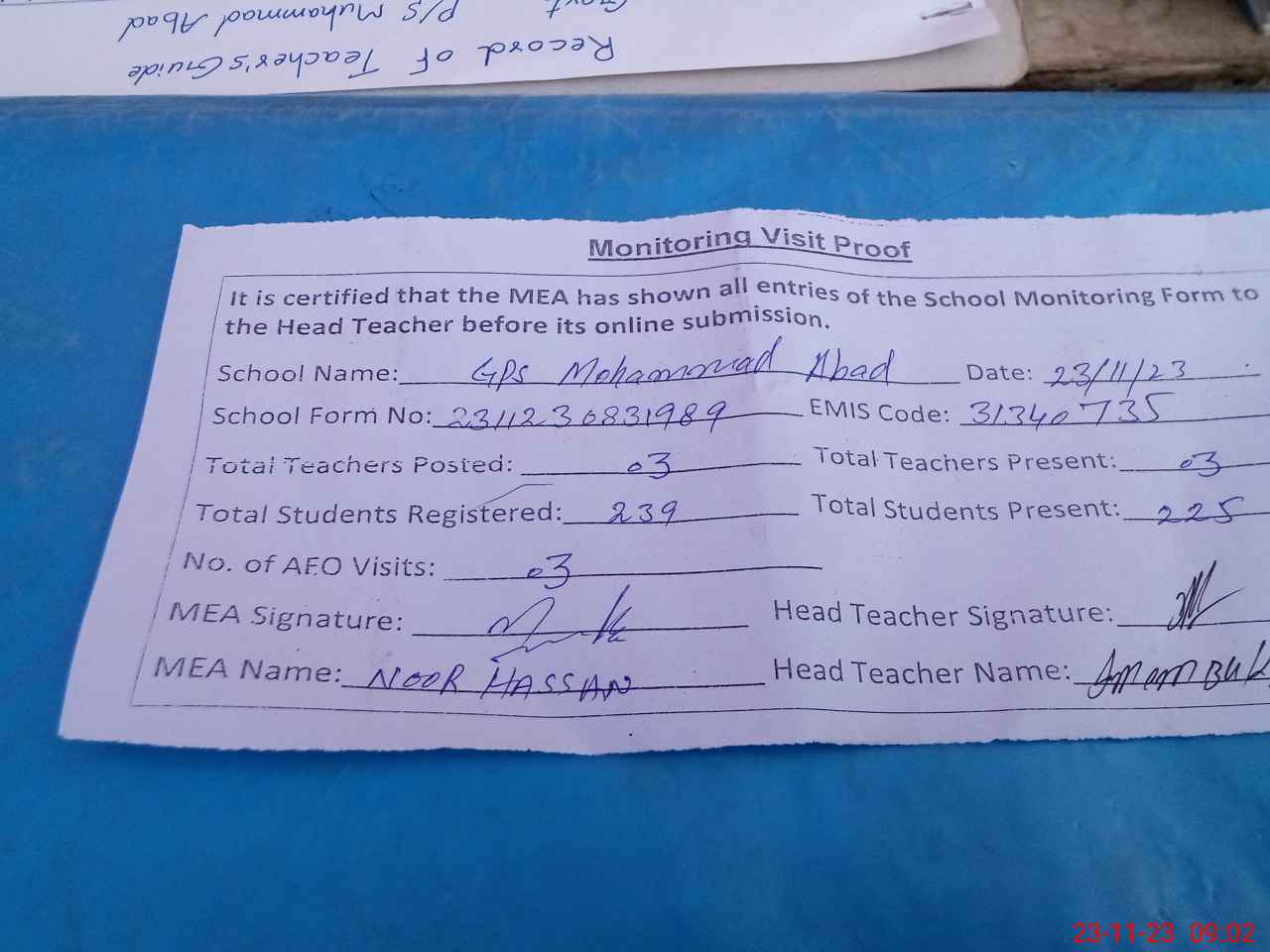 | EMIS Code: 31340735 | Name of School: GPS MUHAMMAD ABAD | |||