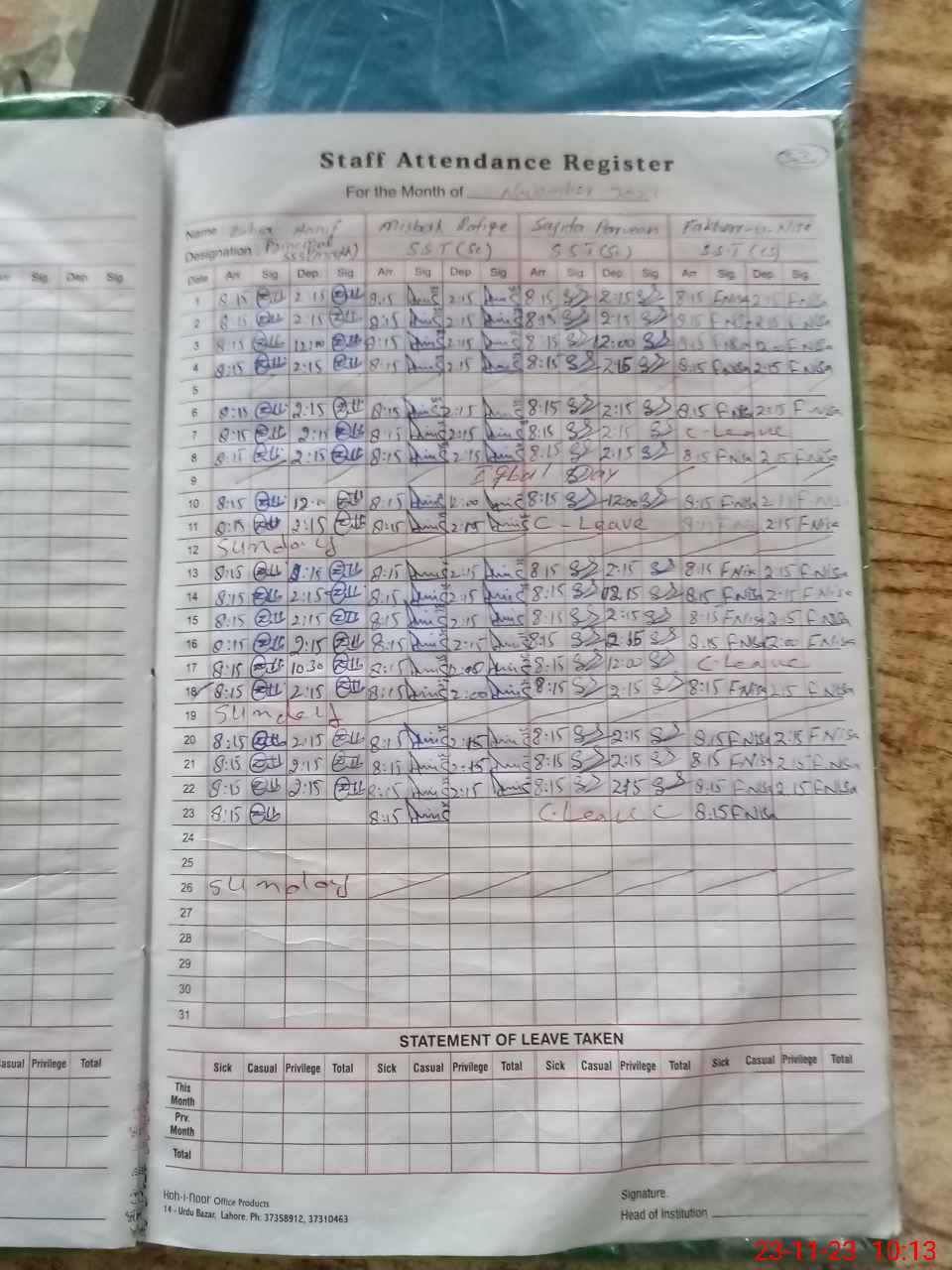| CNIC | Full Name | Designation | R/C | Absence During Last Calender Month |