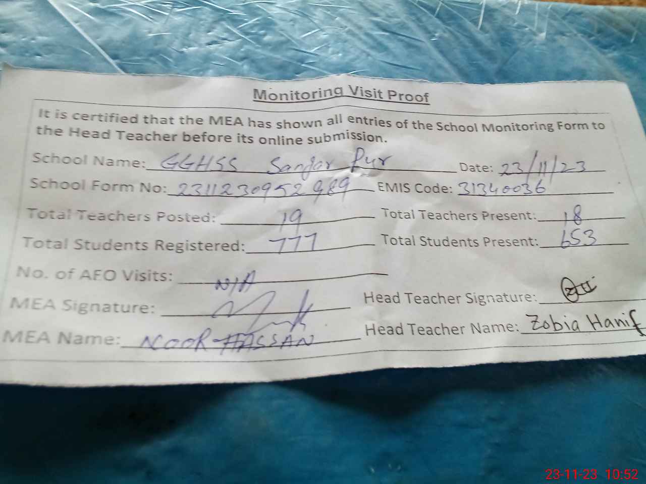 | Monitoring Date: 23-11-2023 | Start Time: 23-11-2023 09:51 AM | End Time: 23-11-2023 11:00 AM | Name of MEA: No**** Ha**** | |