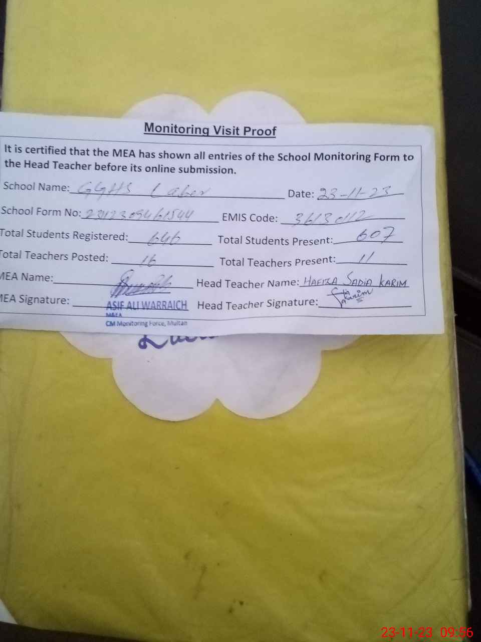 | Attendance Register | Head Teacher | MEA with School | Visit Proof |