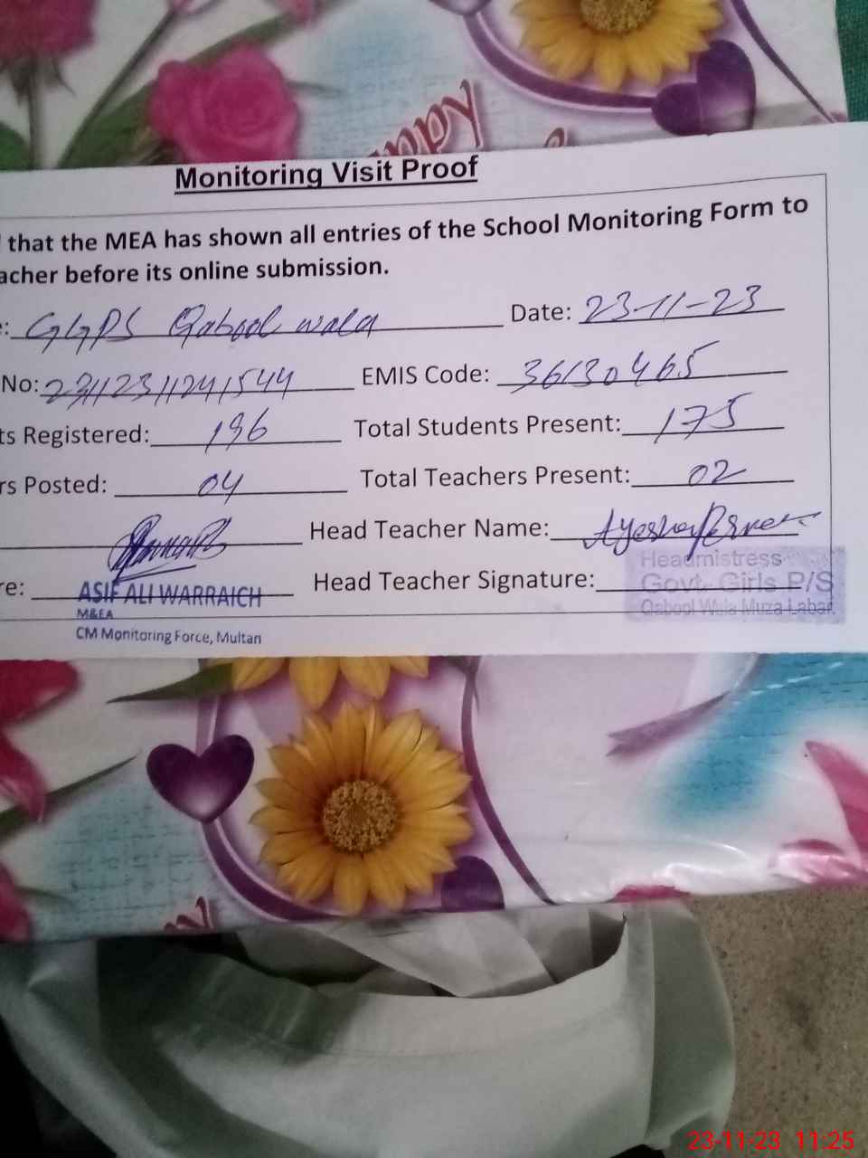 | Attendance Register | Head Teacher | MEA with School | Visit Proof |