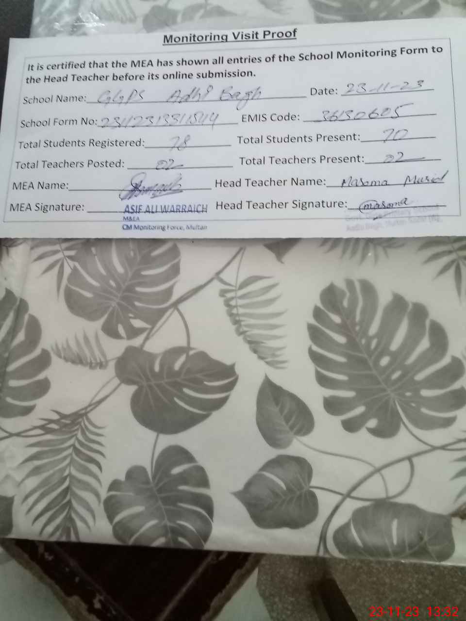 | Attendance Register | Head Teacher | MEA with School | Visit Proof |