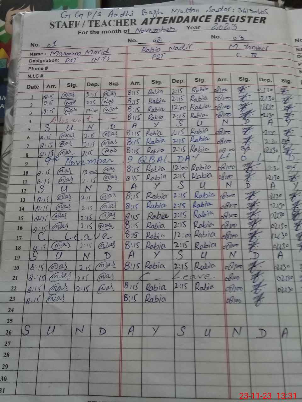 | CNIC | Full Name | Designation | R/C | Absence During Last Calender Month |