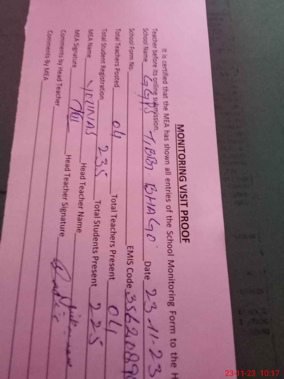 | Attendance Register | Head Teacher | MEA with School | Visit Proof |