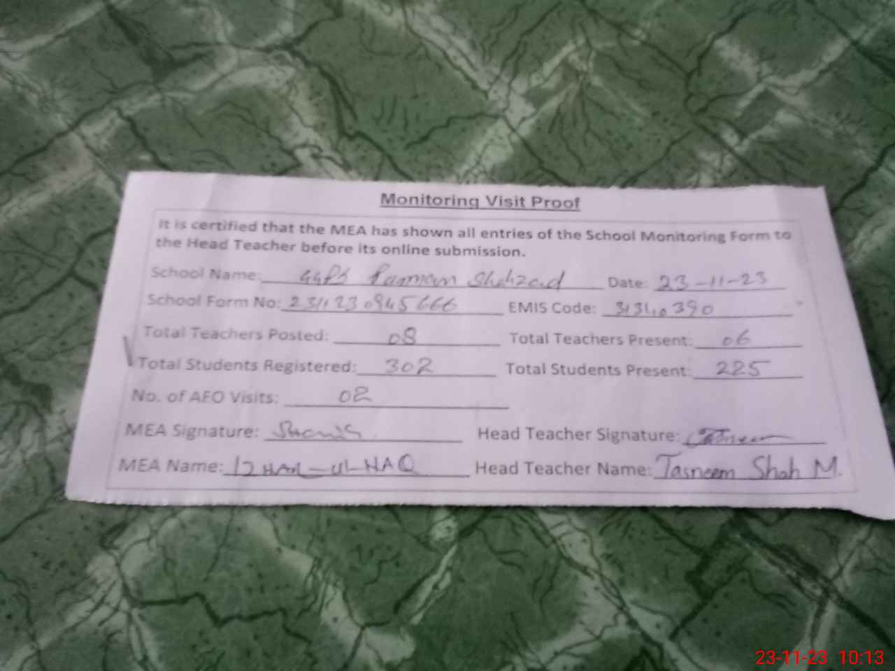 | Monitoring Date: 23-11-2023 | Start Time: 23-11-2023 09:23 AM | End Time: 23-11-2023 10:16 AM | Name of MEA: Mu**** Iz**** UlHa**** | |