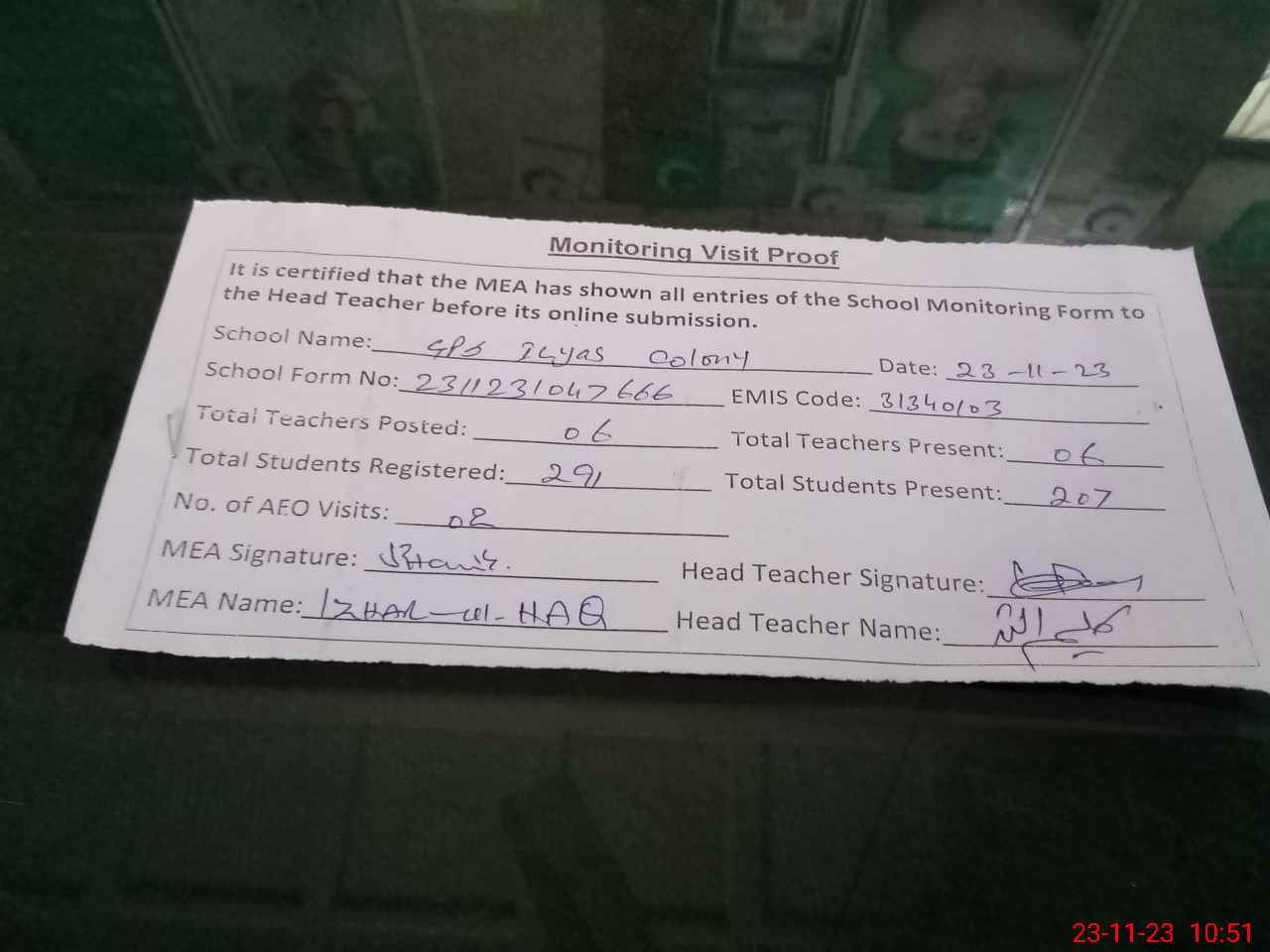 | Attendance Register | Head Teacher | MEA with School | Visit Proof |