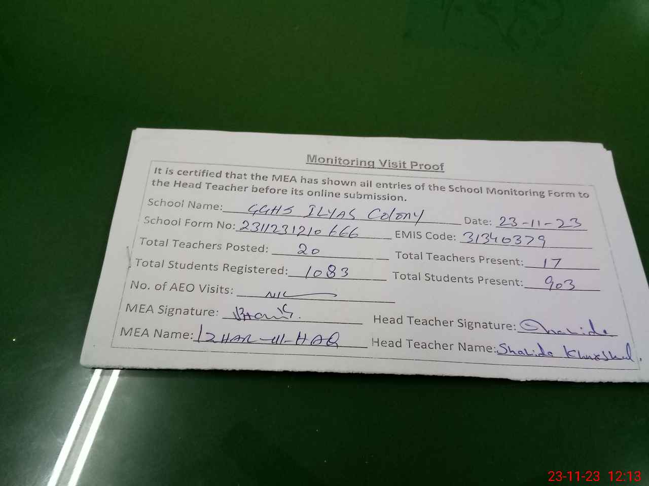 | Attendance Register | Head Teacher | MEA with School | Visit Proof |