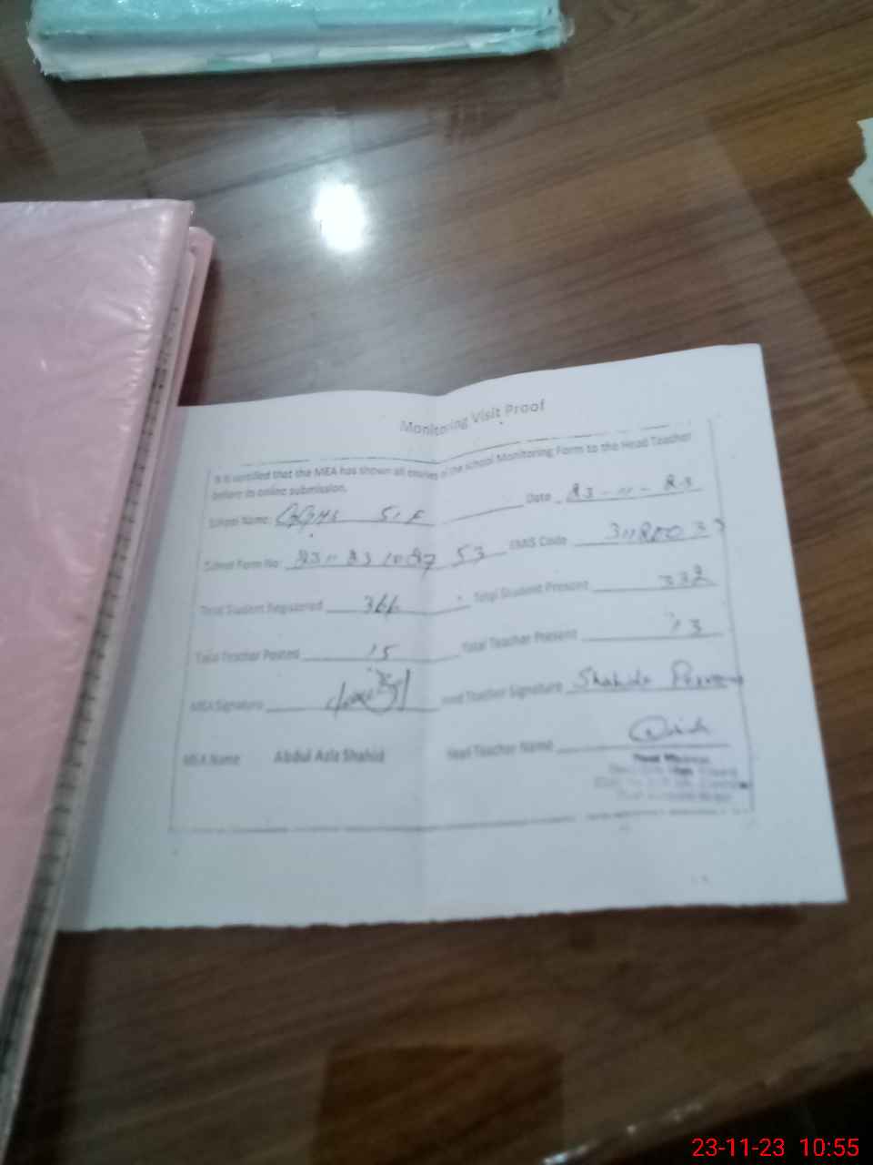| Attendance Register | Head Teacher | MEA with School | Visit Proof |