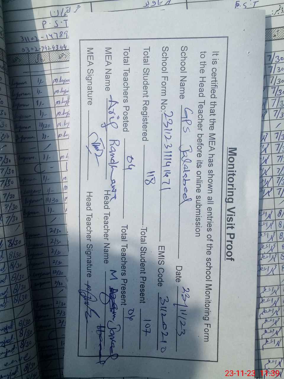 | Name: MU**** JA**** Designation: (School Headmaster's/Headmistress's) PST Phone/Cell Number: 03**** |