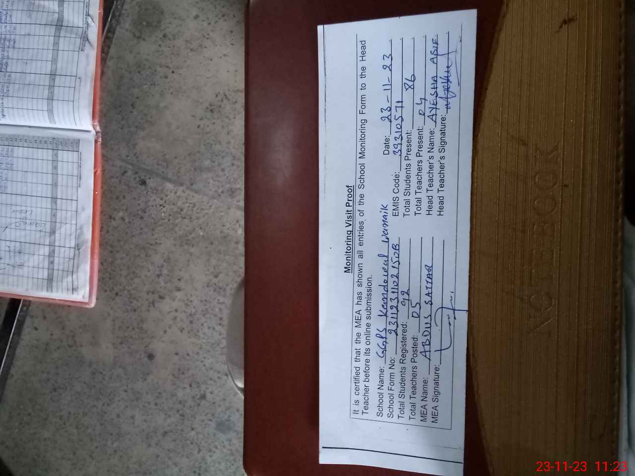 | Attendance Register | Head Teacher | MEA with School | Visit Proof |