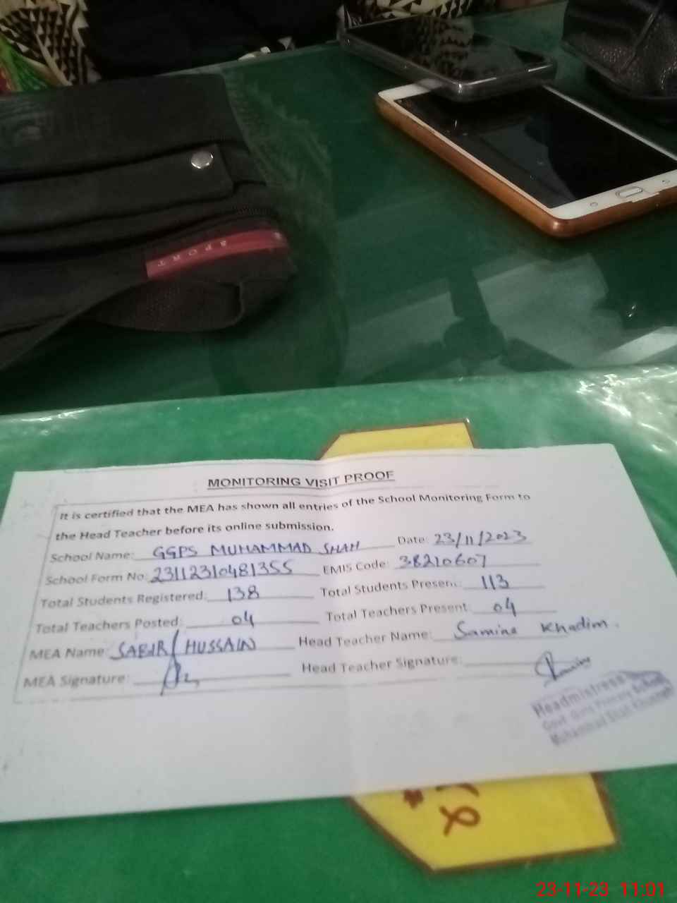 | Attendance Register | Head Teacher | MEA with School | Visit Proof |