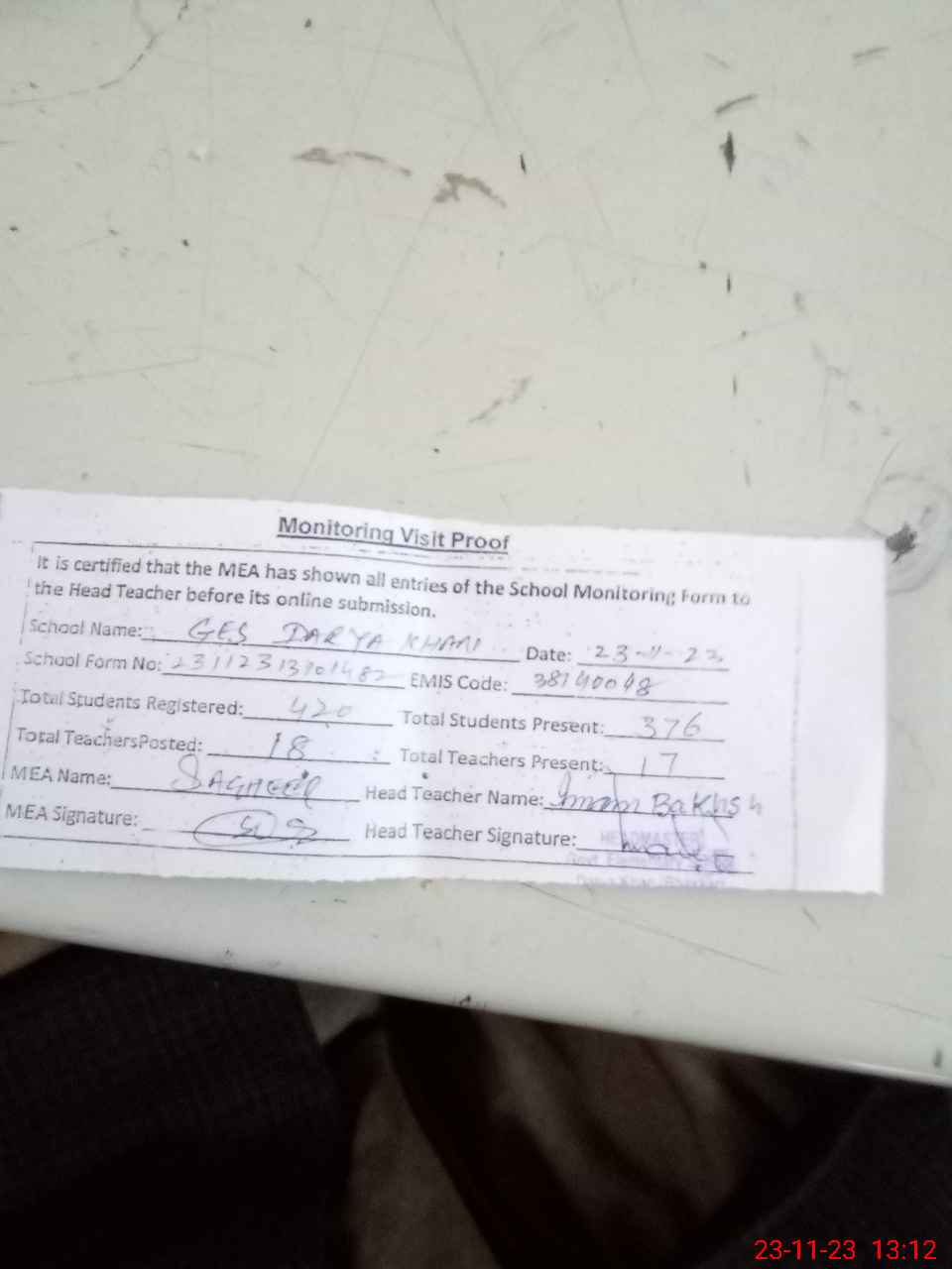 | Attendance Register | Head Teacher | MEA with School | Visit Proof |