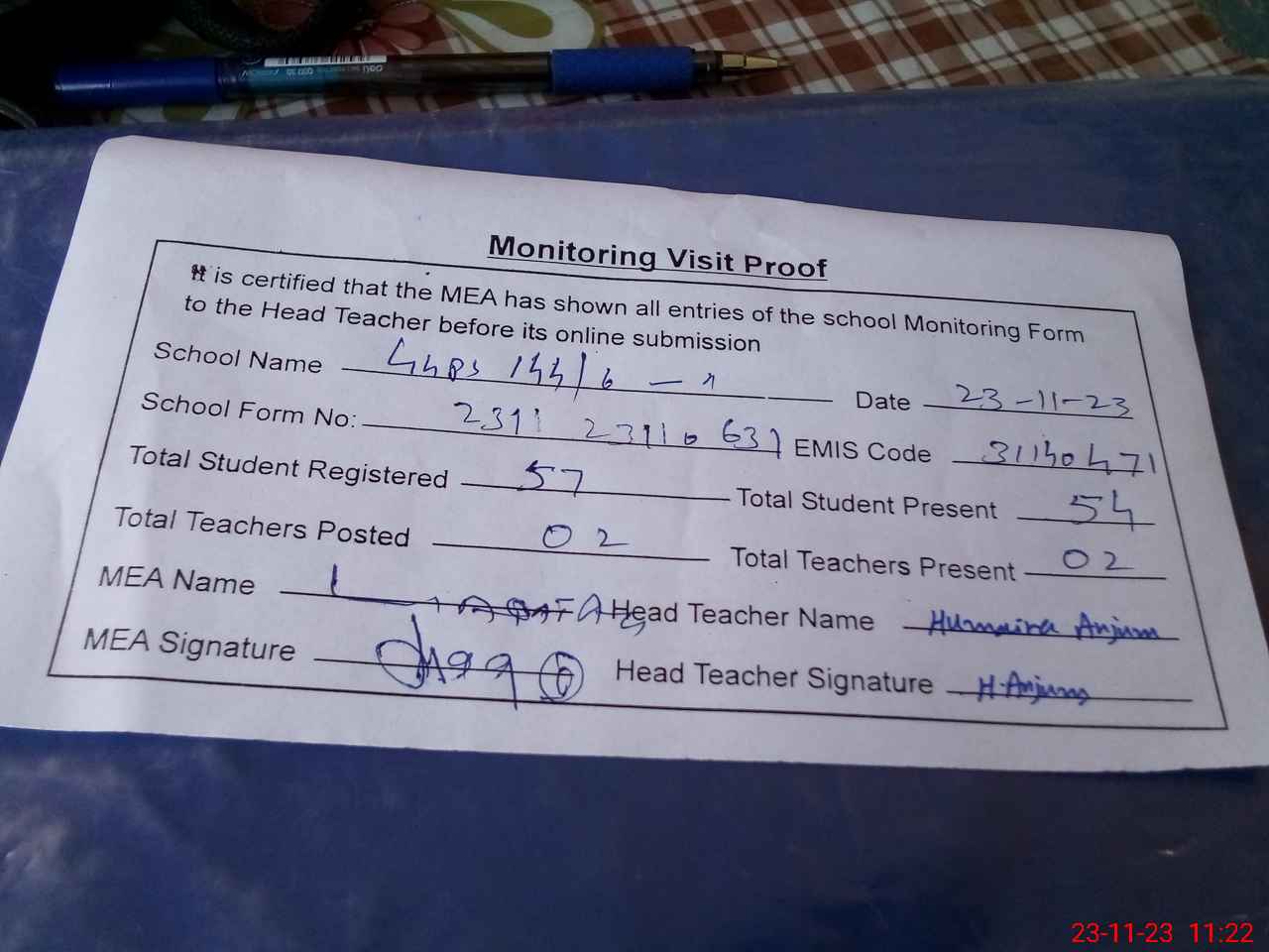 | Attendance Register | Head Teacher | MEA with School | Visit Proof |