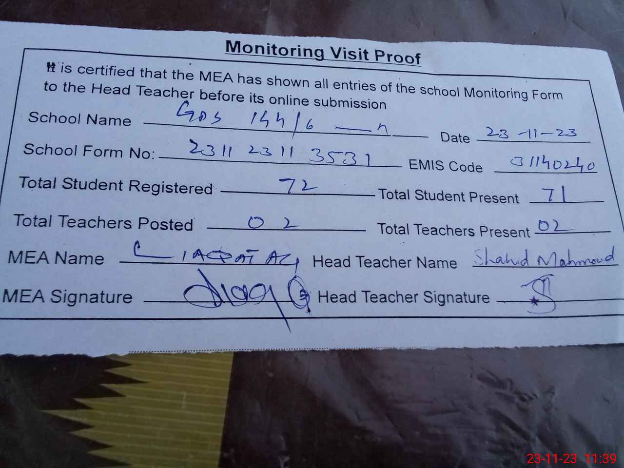 | Attendance Register | Head Teacher | MEA with School | Visit Proof |