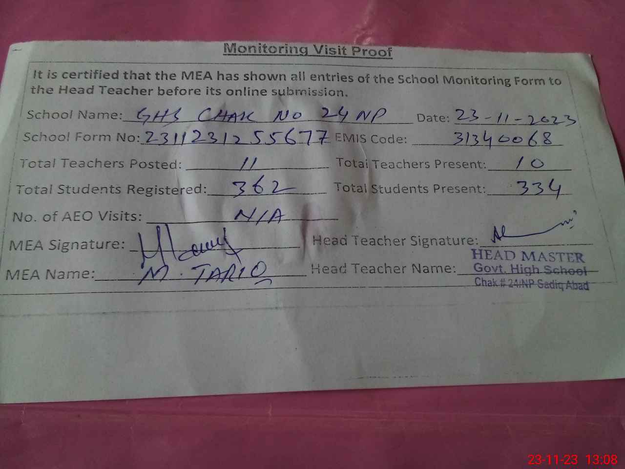 | Attendance Register | Head Teacher | MEA with School | Visit Proof |