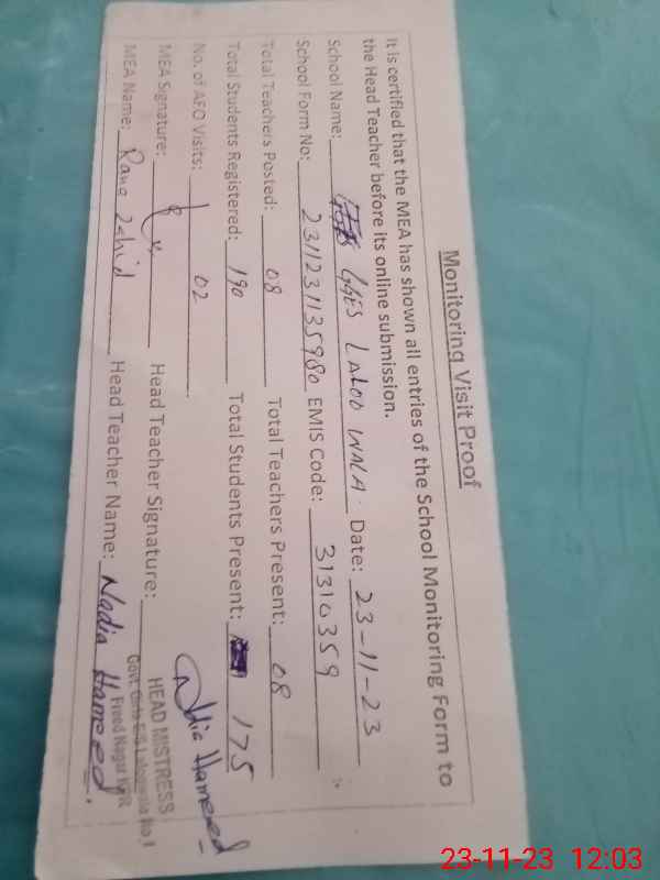 | Attendance Register | Head Teacher | MEA with School | Visit Proof |