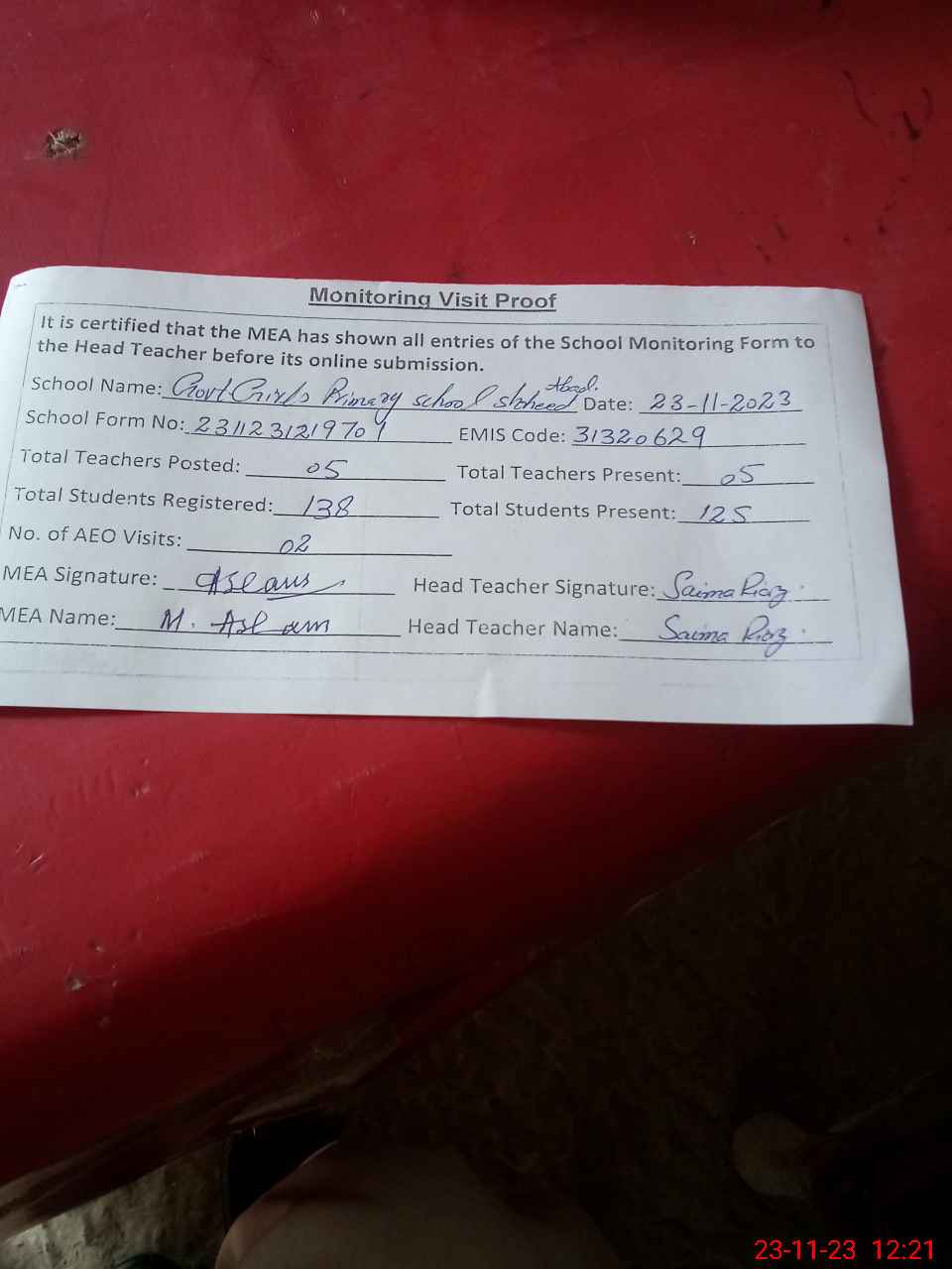 | Attendance Register | Head Teacher | MEA with School | Visit Proof |