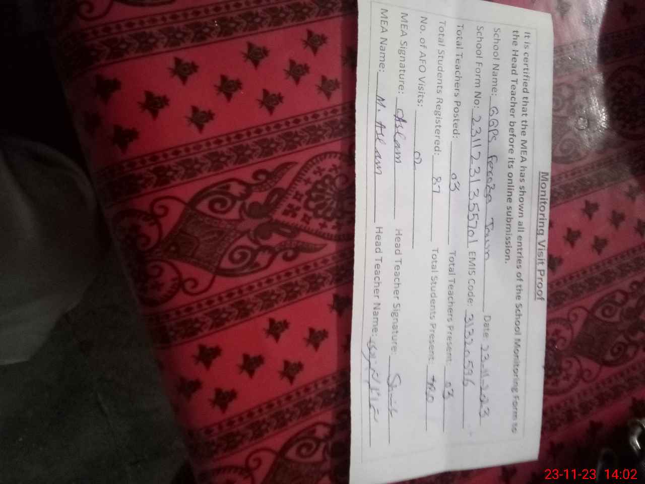 | Attendance Register | Head Teacher | MEA with School | Visit Proof |
