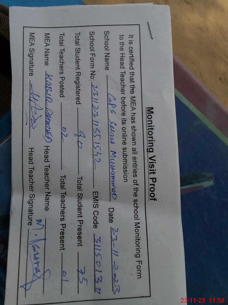 | Attendance Register | Head Teacher | MEA with School | Visit Proof |