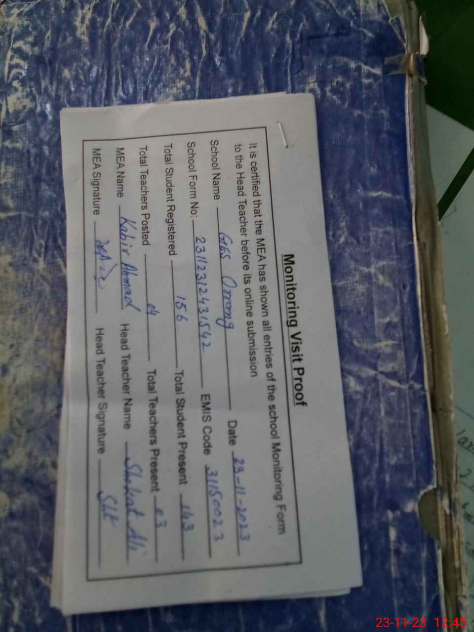| Attendance Register | Head Teacher | MEA with School | Visit Proof |