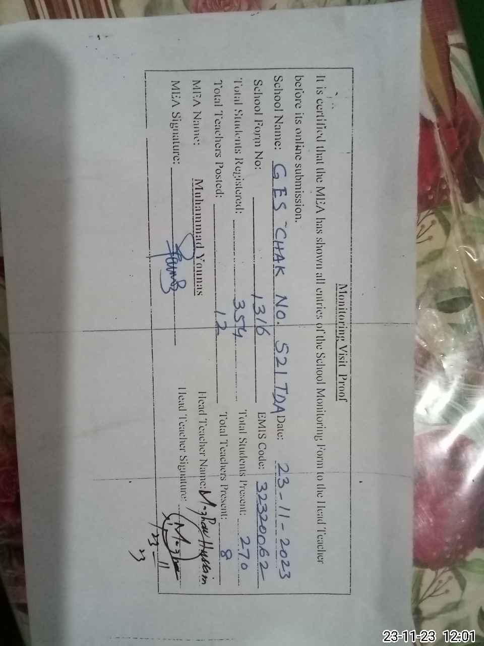 | Name: MA**** HU**** Designation: (School Headmaster's/Headmistress's) SST Phone/Cell Number: 03**** |
