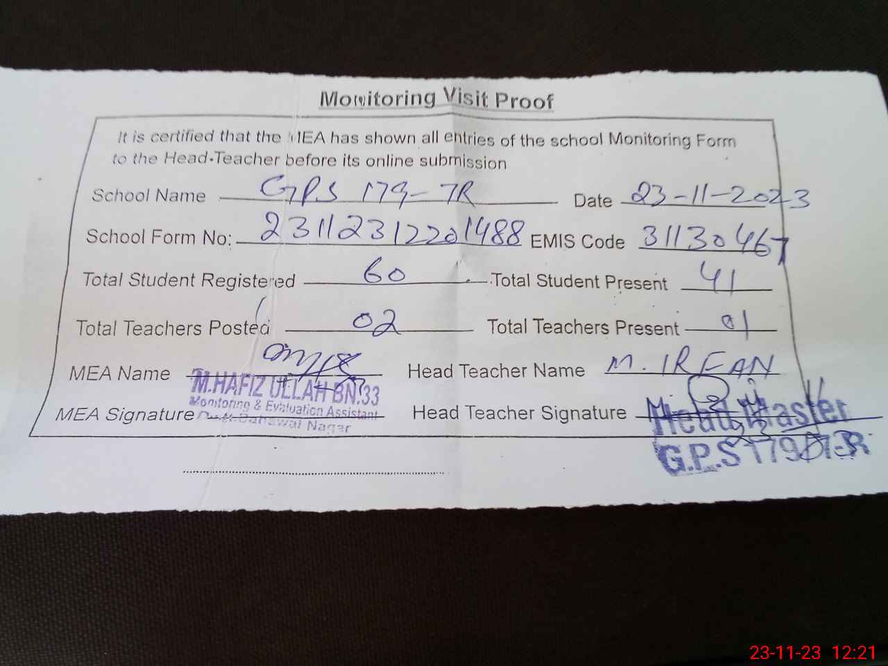 | Attendance Register | Head Teacher | MEA with School | Visit Proof |