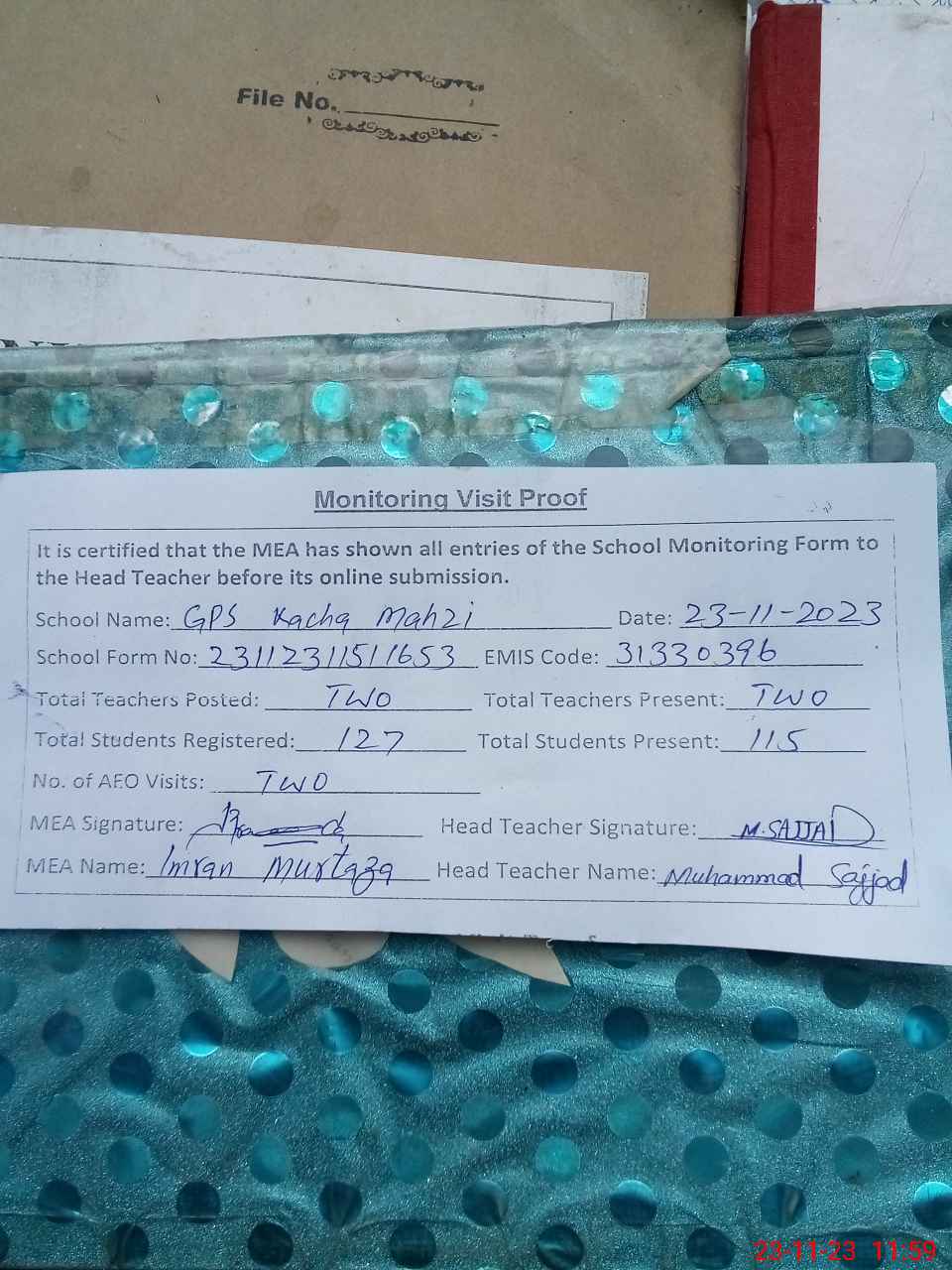 | Attendance Register | Head Teacher | MEA with School | Visit Proof |
