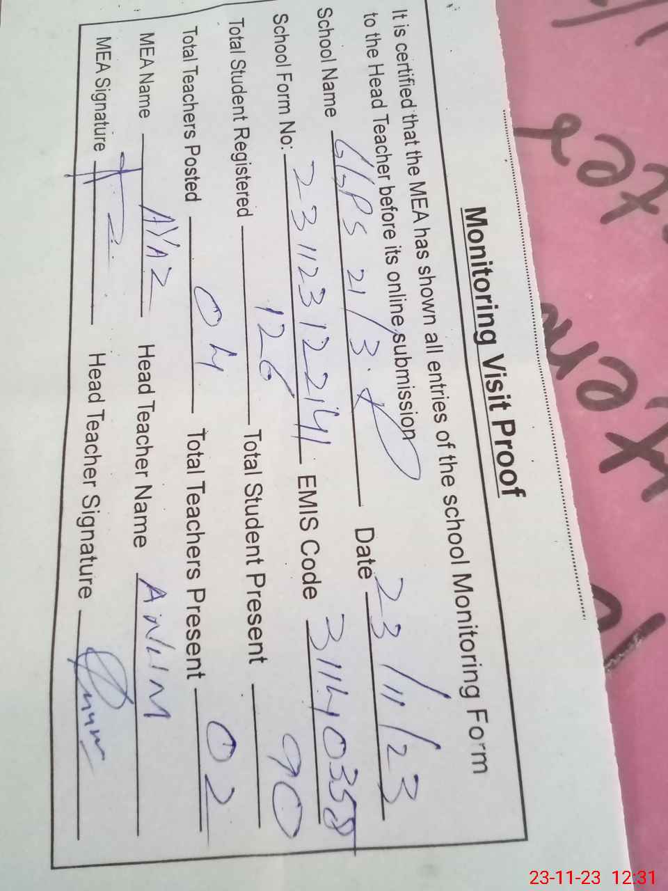 | Attendance Register | Head Teacher | MEA with School | Visit Proof |