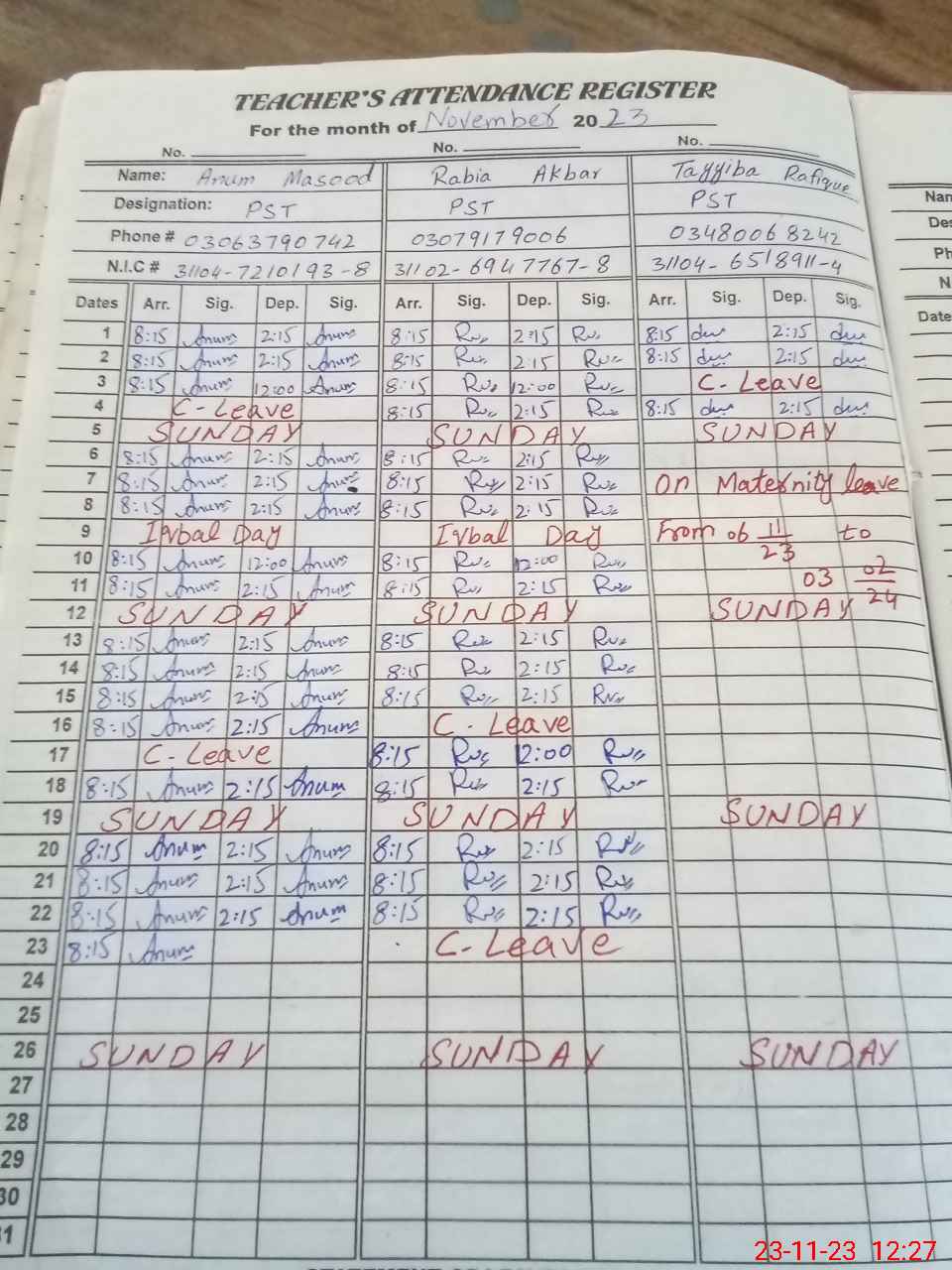 | CNIC | Full Name | Designation | R/C | Absence During Last Calender Month |