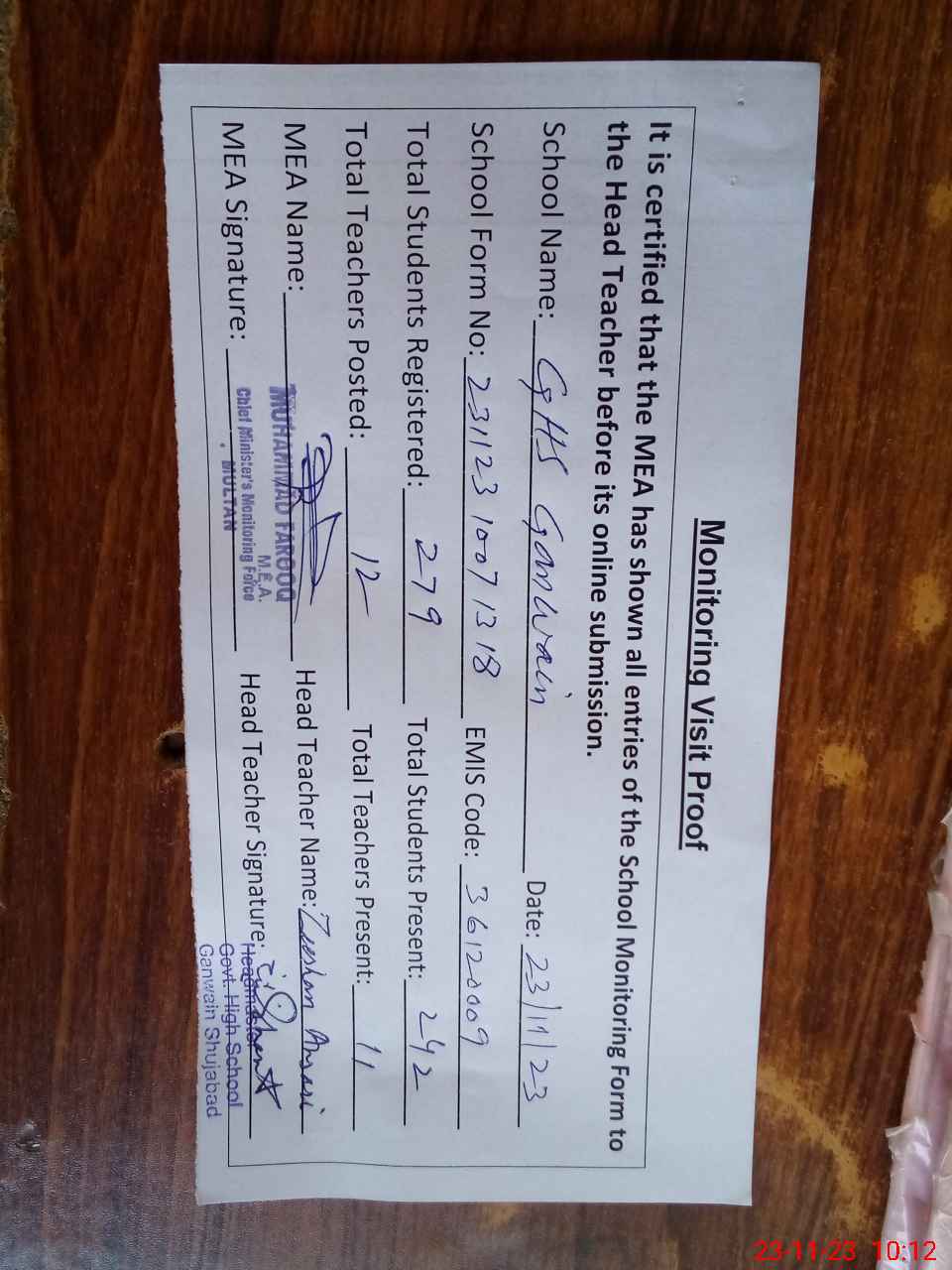 | Attendance Register | Head Teacher | MEA with School | Visit Proof |