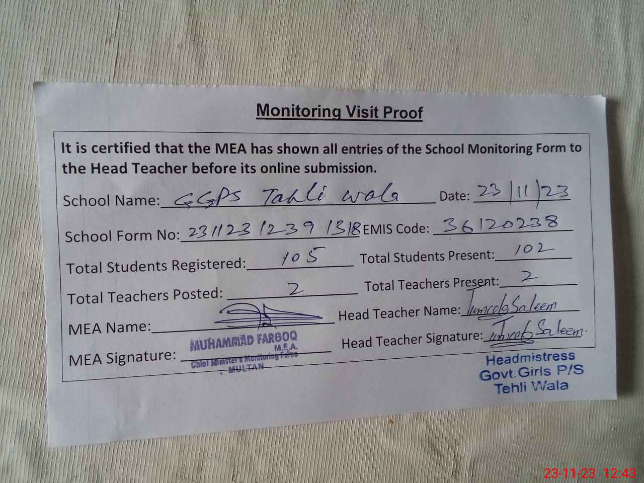 | EMIS Code: 36120238 | Name of School: GGPS TAHLI WALA SHUJABAD | |||