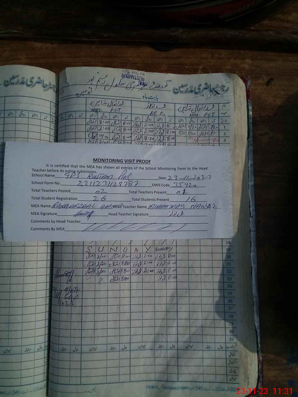 | Attendance Register | Head Teacher | MEA with School | Visit Proof |