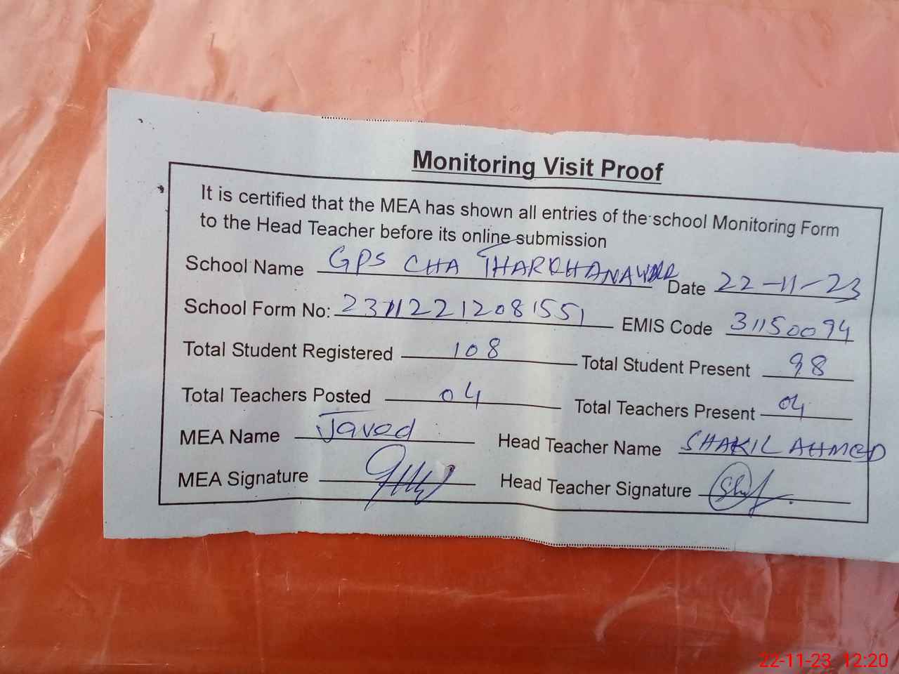 | Attendance Register | Head Teacher | MEA with School | Visit Proof |
