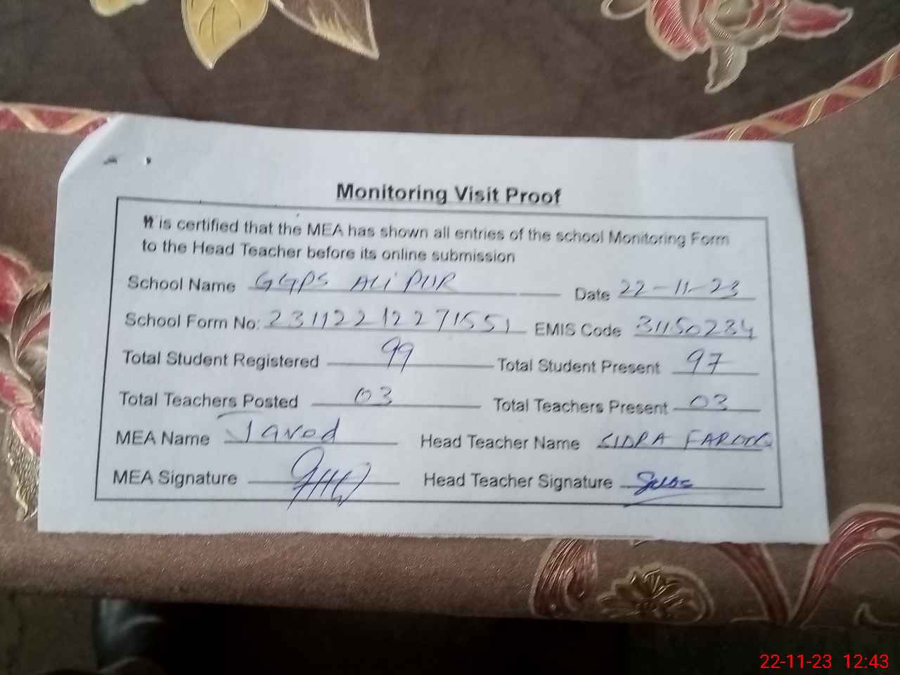 | Attendance Register | Head Teacher | MEA with School | Visit Proof |