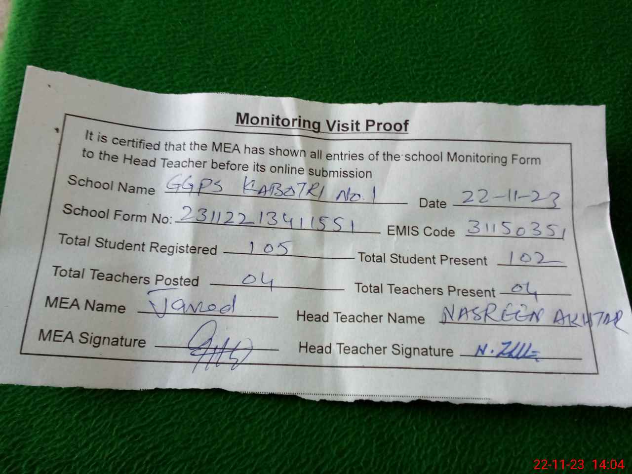 | EMIS Code: 31150351 | Name of School: GGPS KABOOTRI NO. 1 | |||
