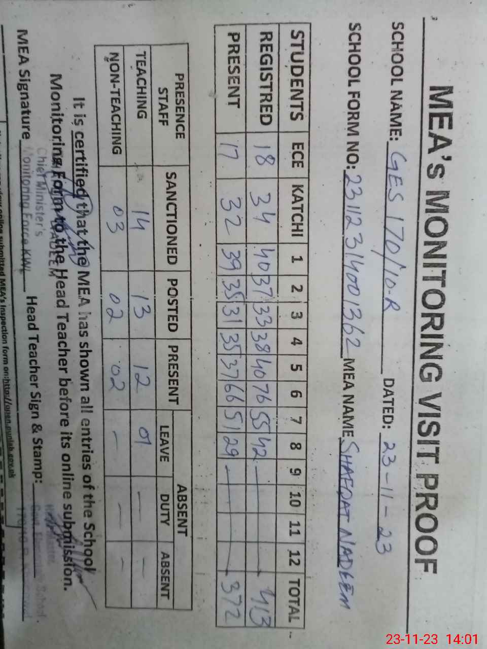 | Attendance Register | Head Teacher | MEA with School | Visit Proof |