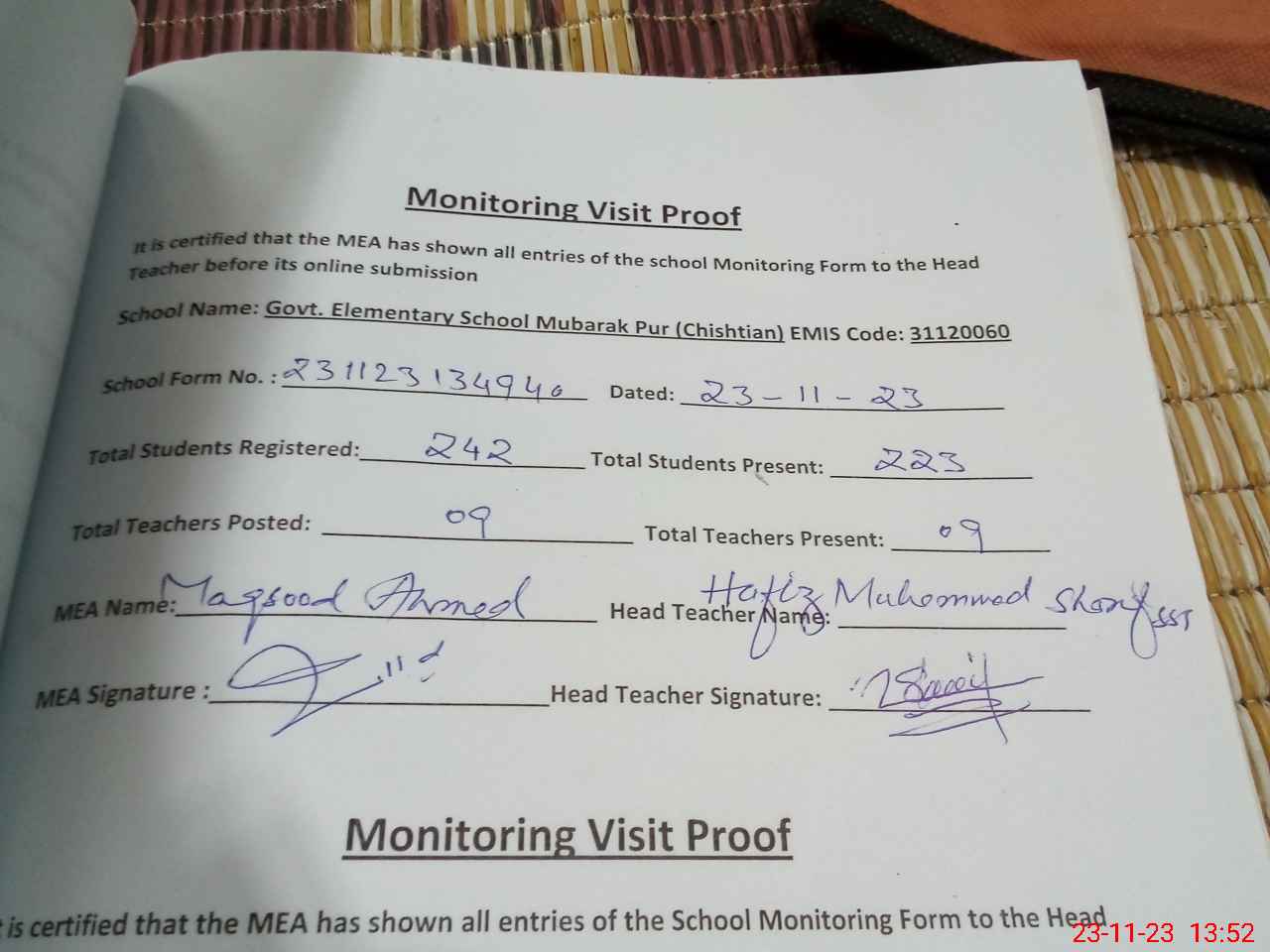 | Attendance Register | Head Teacher | MEA with School | Visit Proof |
