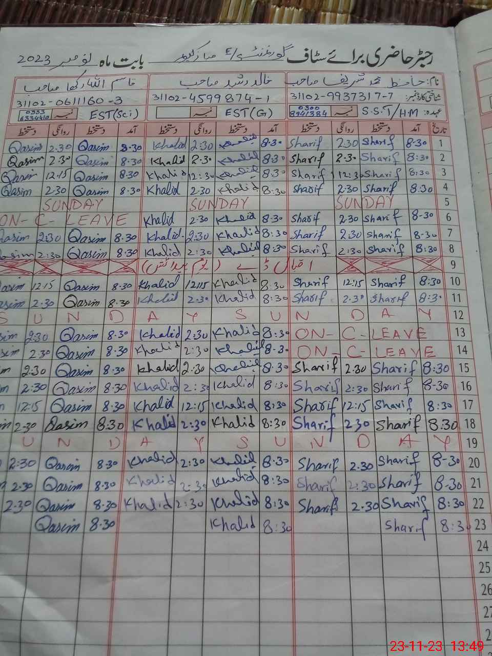 | CNIC | Full Name | Designation | R/C | Absence During Last Calender Month |