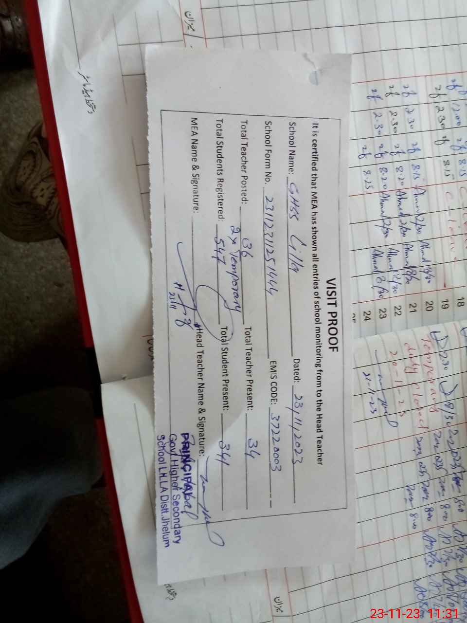 | Total no. of Classrooms: 27 No. of Classrooms Used for Teaching: 25 No. of Classrooms Storing Old Furniture, FTBs, etc: 0Comments if Any: Assalamualaikum Sir SST Teacher Nasir Mehmood On temporary duty to GHSS Lilla from GHSS Jalalpur Sharif but date not mention of joining on official letter |