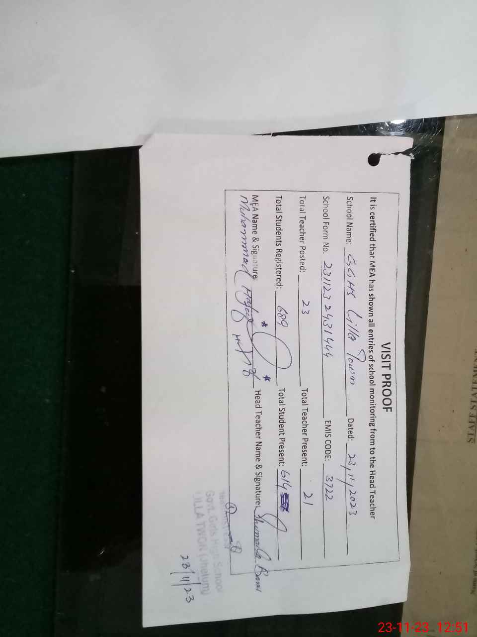 | Attendance Register | Head Teacher | MEA with School | Visit Proof |