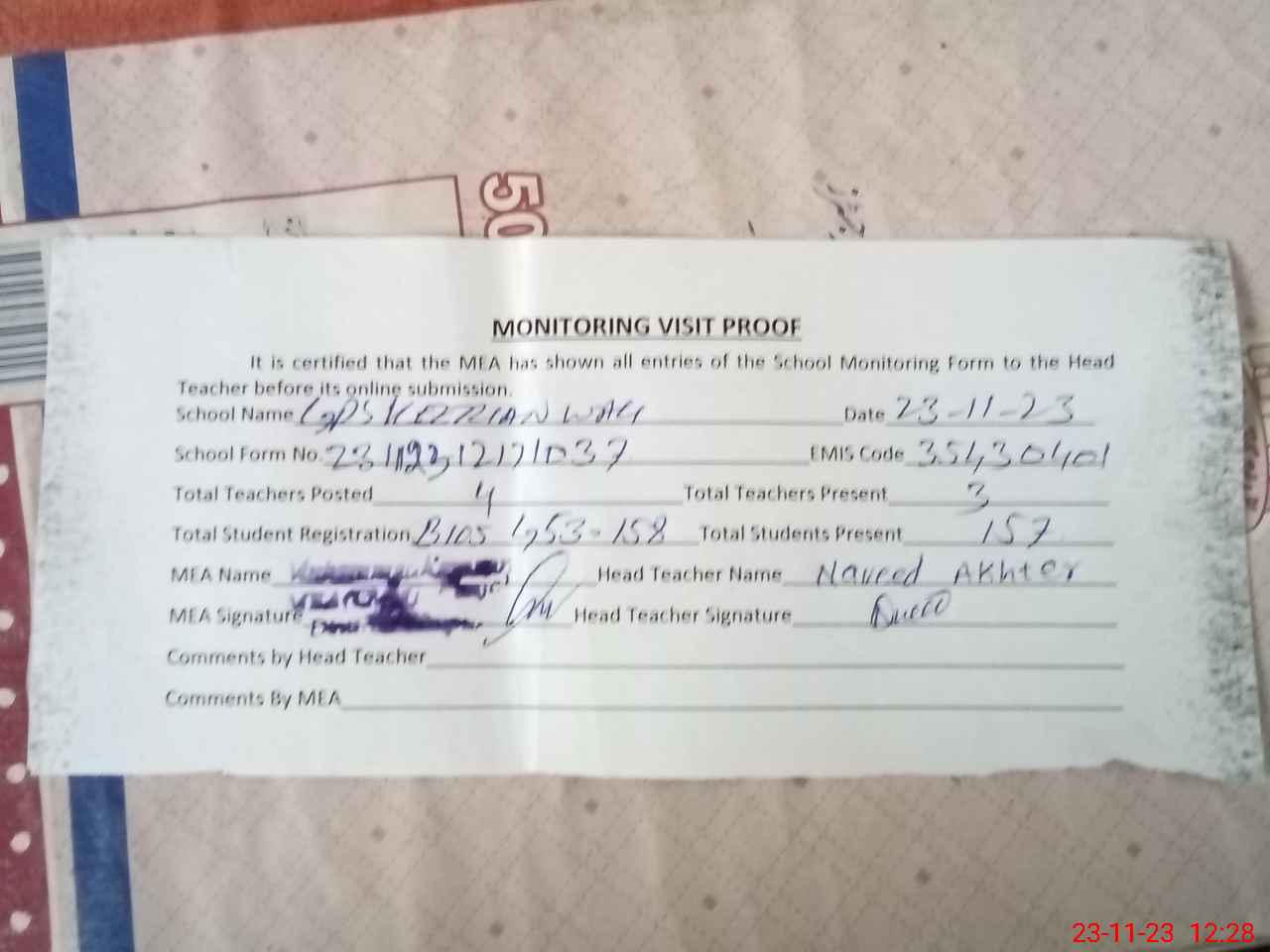 | Attendance Register | Head Teacher | MEA with School | Visit Proof |